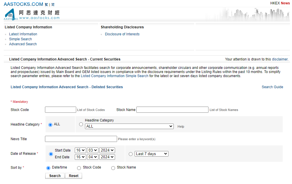 The "Listed Company Information Advanced Search" provided on the Website and the "Information on Listed Companies" provided on the GEM Website allow users to search for listed company documents by using single or multiple parameters. The more parameters you select, the more refined the results will be.  Below is the screen layout of "Listed Company Information Advanced Search" and "Information on Listed Companies":