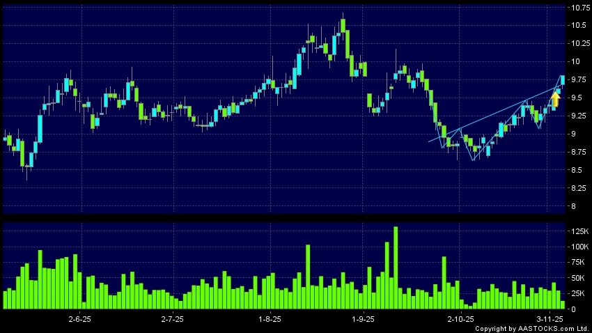 CHINA UNICOM(00762.HK) appears an upside breakout, rose above the neckline. Last printed at 9.810; rose 1.975%; on volume of 13.39M shares and turnover of $130.67MRecent Performanc...