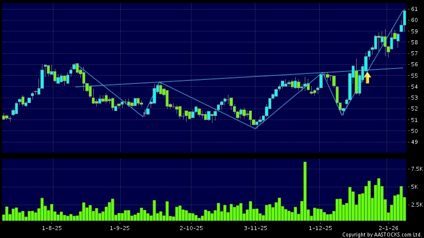 CKI HOLDINGS(01038.HK) appears an upside breakout, rose above the neckline. Last printed at 60.850; rose 2.183%; on volume of 3.54M shares and turnover of $214.29MRecent Performanc...