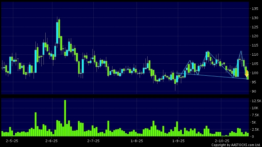 MAO GEPING(01318.HK)  0.000 (0.000%)    Short selling $41.44M; Ratio 29.780%   appears a downside breakout, dropped below the neckline. Last printed at 96.300; fell 3.070%; on volume of 1.23M shares and turnover of $119.94M
