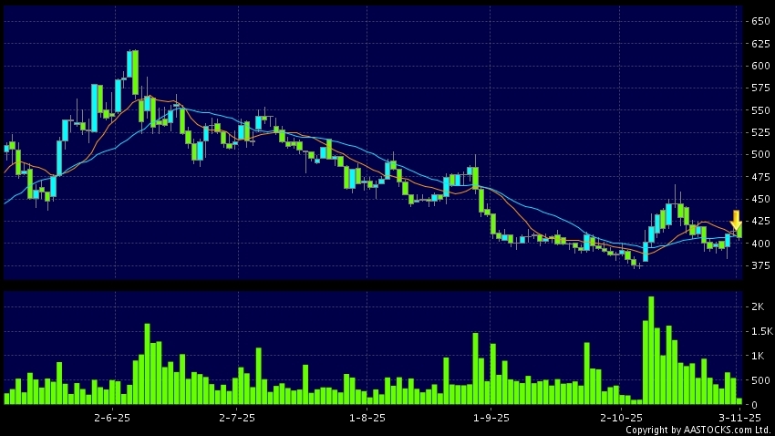MIXUE GROUP(02097.HK)  -0.200 (-0.049%)    Short selling $289.40K; Ratio 0.781%   's SMA 10 crosses below SMA 20, which is a death cross. Last printed at 406.000; fell 1.790%; on volume of 130.84K shares and turnover of $53.42M