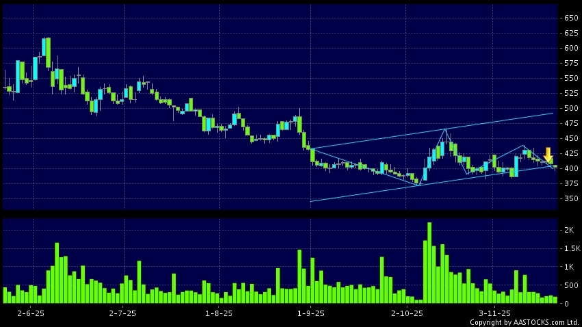 MIXUE GROUP(02097.HK)  -0.200 (-0.049%)    Short selling $289.40K; Ratio 0.781%   appears a downside range breakout. Last printed at 402.000; fell 1.277%; on volume of 184.16K shares and turnover of $73.47M