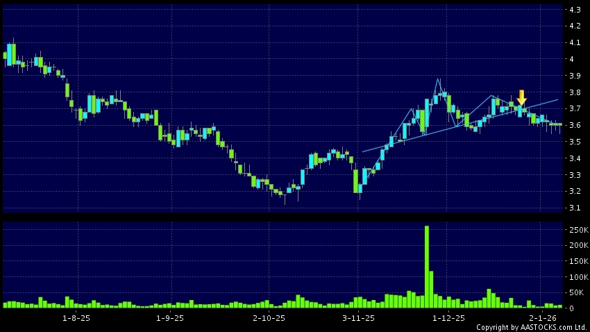 Head Shoulders top is a typical bearish signal, when stock price breaks the supportive level, downtrend would possibly start.(HK stocks quote is delayed for at least 15 mins.Short Selling Data as at 2026-01-12 16:25.)