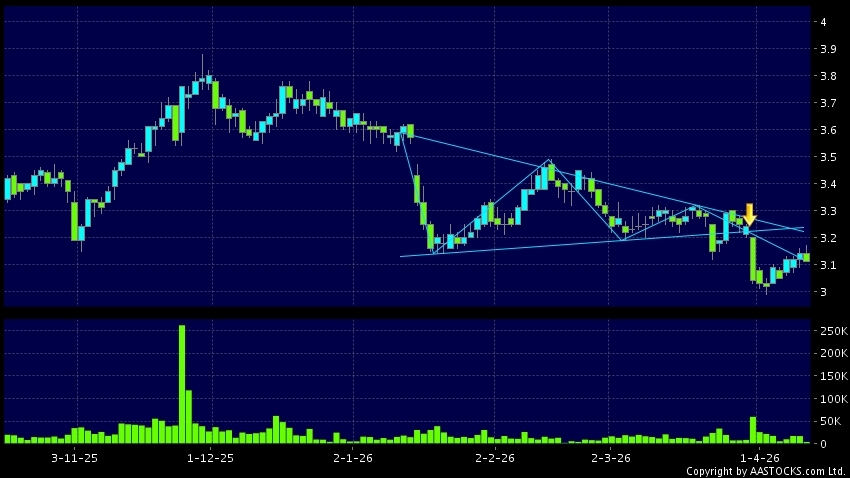 Triangle Breakout means the volatility of price movement is decreasing, stock price finally broke the bottom of triangle. A downward trend will start.(HK stocks quote is delayed for at least 15 mins.Short Selling Data as at 2026-04-17 16:25.)