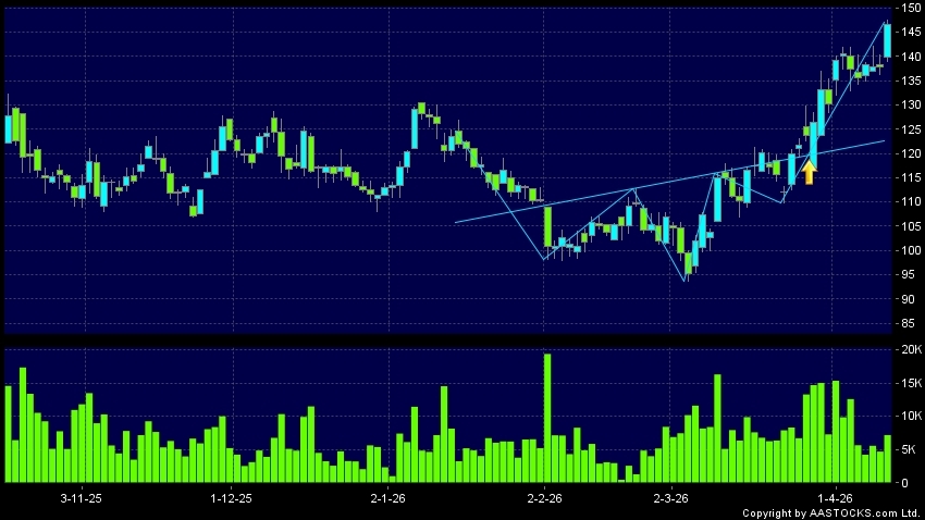 AKESO(09926.HK) appears an upside breakout, rose above the neckline. Last printed at 145.900; rose 5.801%; on volume of 7.27M shares and turnover of $1.04BRecent PerformanceIn 3 da...