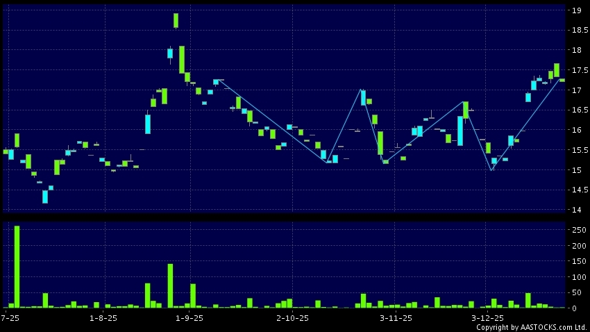 LI NING-R(82331.HK)  -0.180 (-1.047%)   shows a triple bottom reversal. Last printed at 17.200; rose 0.058%; on volume of 2.50K shares and turnover of $43.18K