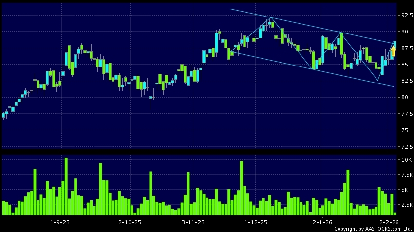 区域突破指股价在过去的一段时间只在一个范围在内活动,然後股价上升作出突破,升穿区域的顶部,技术走势向好。(港股报价延迟最少十五分钟。沽空资料截至 2026-02-04 12:25。)