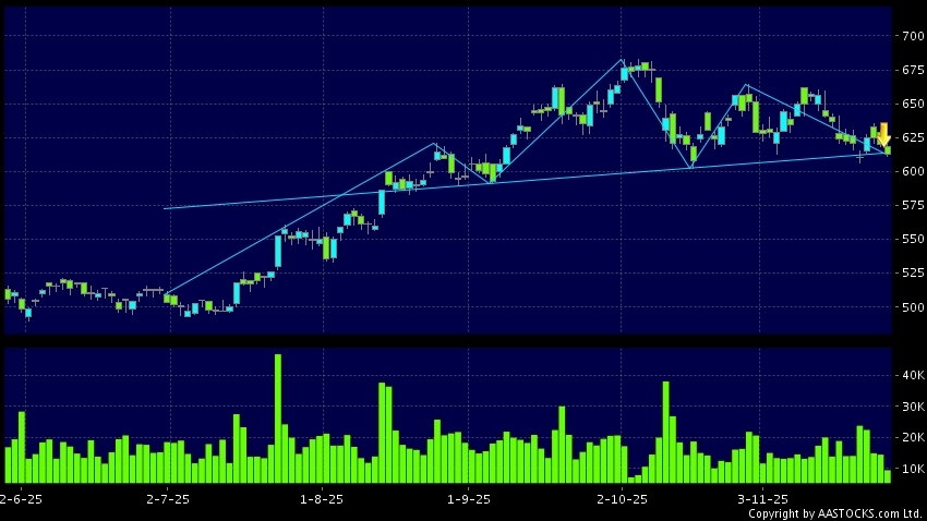 腾讯控股(00700.HK) -8.000 (-1.291%) 沽空 $9.42亿; 比率 9.910% 呈现头肩顶向下突破。现价报613.000,下跌1.049%,成交量9.65百万股,成交额59.33亿。