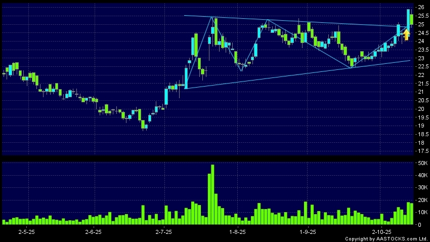 三角形向上突破是指股价的波幅渐渐收窄,在图表上形成三角形般的状态。股价在三角形的末端向上突破,形成上升趋势,技术走势向好。(港股报价延迟最少十五分钟。沽空资料截至 2025-10-17 16:25。)