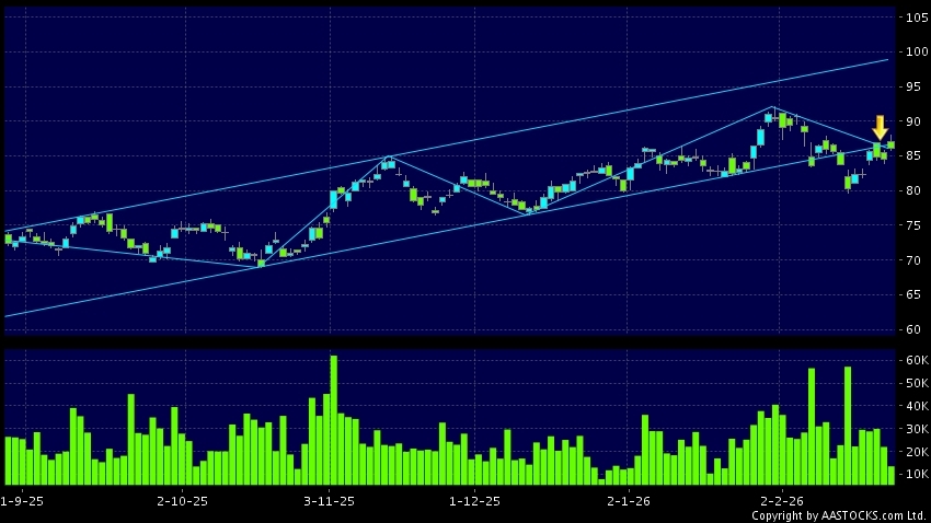 区域突破指股价在过去的一段时间只在一个范围在内活动,然後股价下跌作出突破,跌穿区域的底部,技术走势偏软。(港股报价延迟最少十五分钟。沽空资料截至 2026-02-27 16:25。)