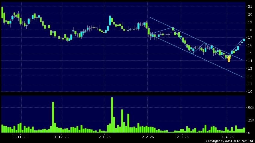 区域突破指股价在过去的一段时间只在一个范围在内活动,然後股价上升作出突破,升穿区域的顶部,技术走势向好。(港股报价延迟最少十五分钟。沽空资料截至 2026-04-20 16:25。)