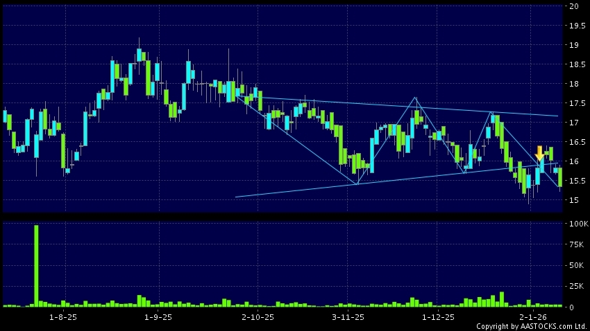 三角形向下突破是指股价的波幅渐渐收窄,在图表上形成三角形般的状态。股价在三角形的末端向下突破,下跌趋势形成,技术走势偏软。(港股报价延迟最少十五分钟。沽空资料截至 2026-01-12 16:25。)