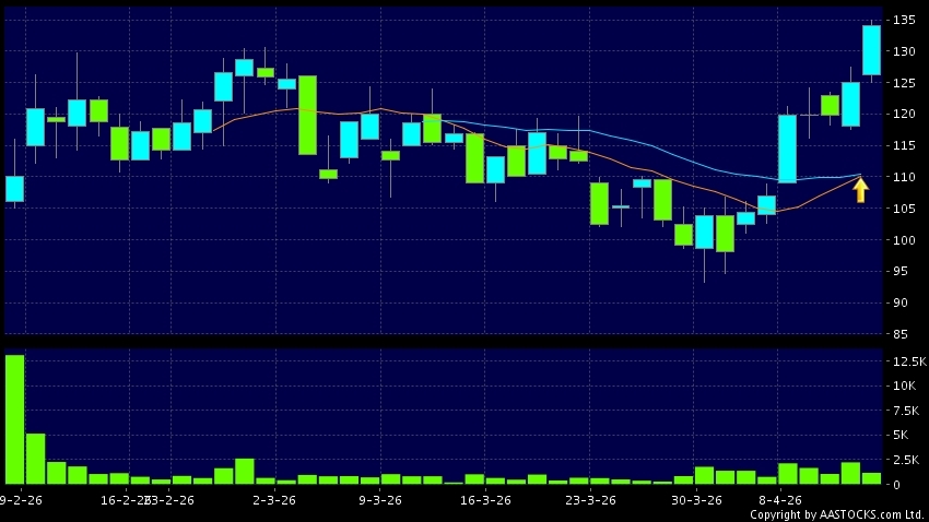 大族数控(03200.HK) +1.700 (+1.156%) 10天移动平均线升穿20天移动平均线,出现黄金交叉。现价报133.600,上升6.880%,成交量1.19百万股,成交额1.54亿。