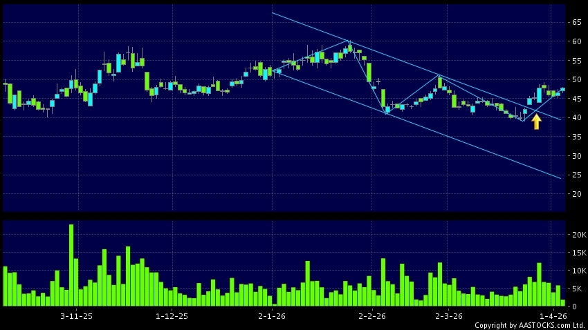 区域突破指股价在过去的一段时间只在一个范围在内活动,然後股价上升作出突破,升穿区域的顶部,技术走势向好。(港股报价延迟最少十五分钟。沽空资料截至 2026-04-20 12:25。)