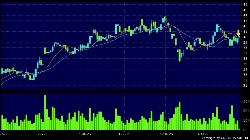 銀河娛樂(00027.HK)10天移動平均線跌穿20天移動平均線,出現死亡交叉。現價報40.080,上升0.957%,成交量1.45百萬股,成交額5.80千萬。最近表現:3日 +1.933%5日 +4...
