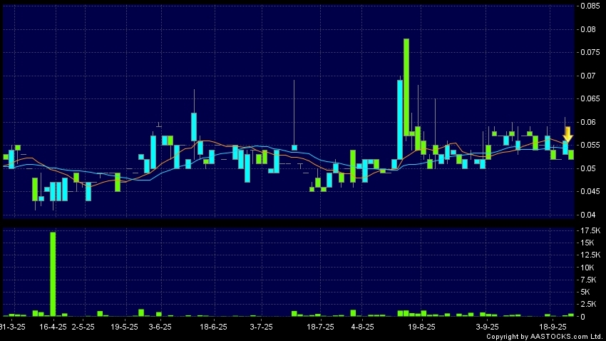 豐德麗控股(00571.HK) -0.004 (-6.667%) 10天移動平均線跌穿20天移動平均線,出現死亡交叉。現價報0.052,下跌7.143%,成交量61.40萬股,成交額3.22萬。