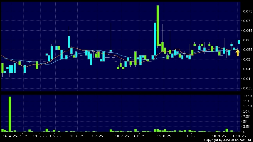 豐德麗控股(00571.HK) -0.004 (-6.667%) 10天移動平均線升穿20天移動平均線,出現黃金交叉。現價報0.060,無升跌,成交量9.53萬股,成交額5.55千。