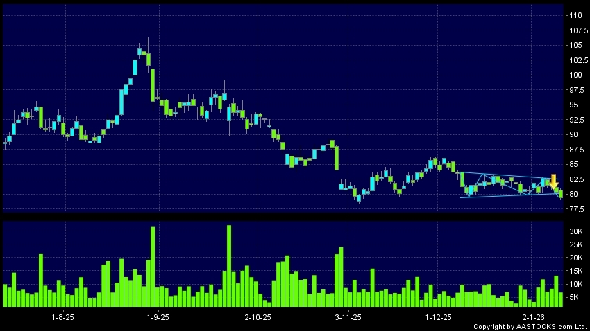 三角形向下突破是指股價的波幅漸漸收窄,在圖表上形成三角形般的狀態。股價在三角形的末端向下突破,下跌趨勢形成,技術走勢偏軟。(港股報價延遲最少十五分鐘。沽空資料截至 2026-01-12 12:25。)