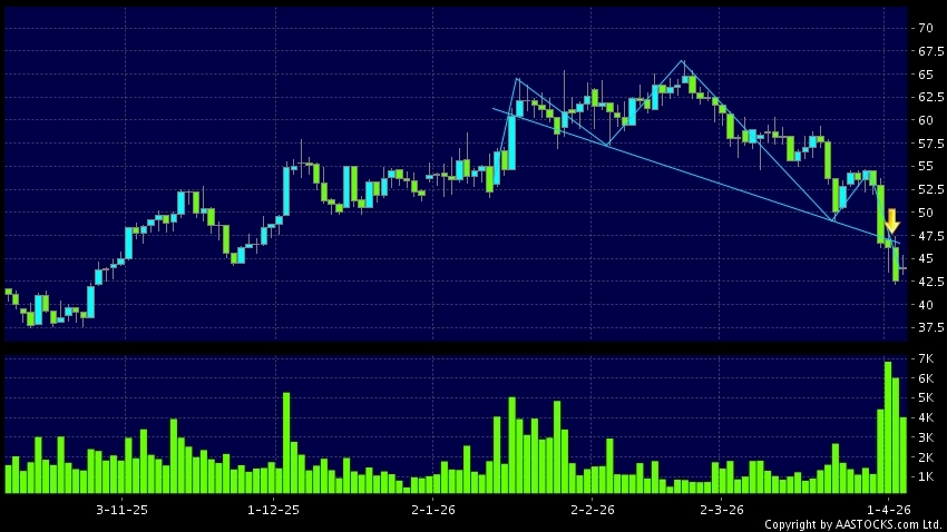 康耐特光學(02276.HK) -2.450 (-4.799%) 沽空 $3.99百萬; 比率 7.582% 呈現頭肩頂向下突破。現價報43.660,上升2.729%,成交量4.14百萬股,成交額1.82億。