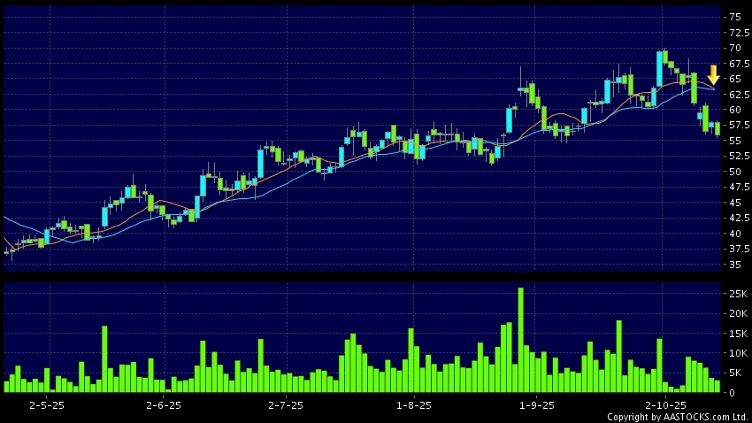 第四範式(06682.HK) -2.450 (-4.235%) 沽空 $2.64千萬; 比率 7.223% 10天移動平均線跌穿20天移動平均線,出現死亡交叉。現價報55.900,下跌3.371%,成交量3.08百萬股,成交額1.74億。