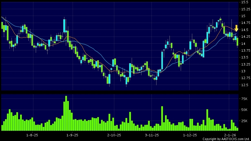 海底撈(06862.HK) +0.780 (+5.575%) 沽空 $1.07億; 比率 18.480% 10天移動平均線跌穿20天移動平均線,出現死亡交叉。現價報13.910,下跌2.523%,成交量9.52百萬股,成交額1.33億。