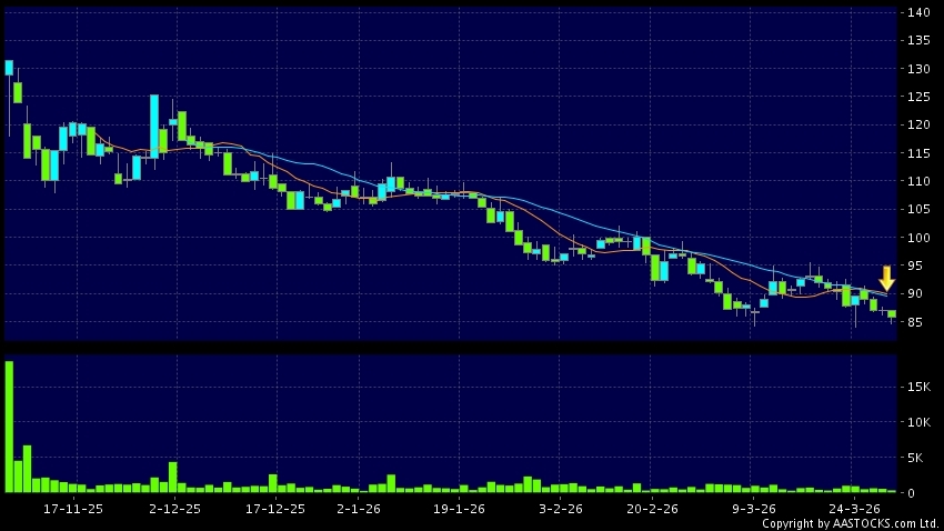 死亡交叉是一個利淡信號,指股價的短期移動平均線跌穿長期移動平均線,例如50天線跌穿250天線,在圖表上構成交叉的形狀。股價通常會下跌形成一個下降趨勢,技術走勢偏軟。(港股報價延遲最少十五分鐘。沽空資料截至 2026-03-30 16:25。)