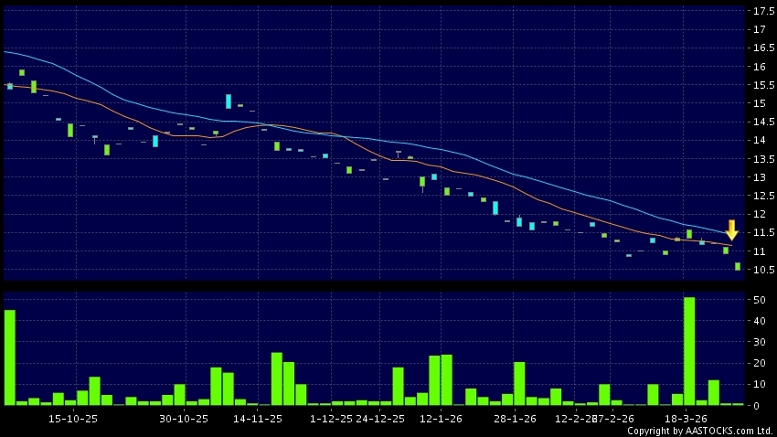 長城汽車-R(82333.HK) -0.460 (-4.197%) 沽空 $5.34千; 比率 50.401% 10天移動平均線跌穿20天移動平均線,出現死亡交叉。現價報10.500,下跌4.197%,成交量1.00千股,成交額1.06萬。